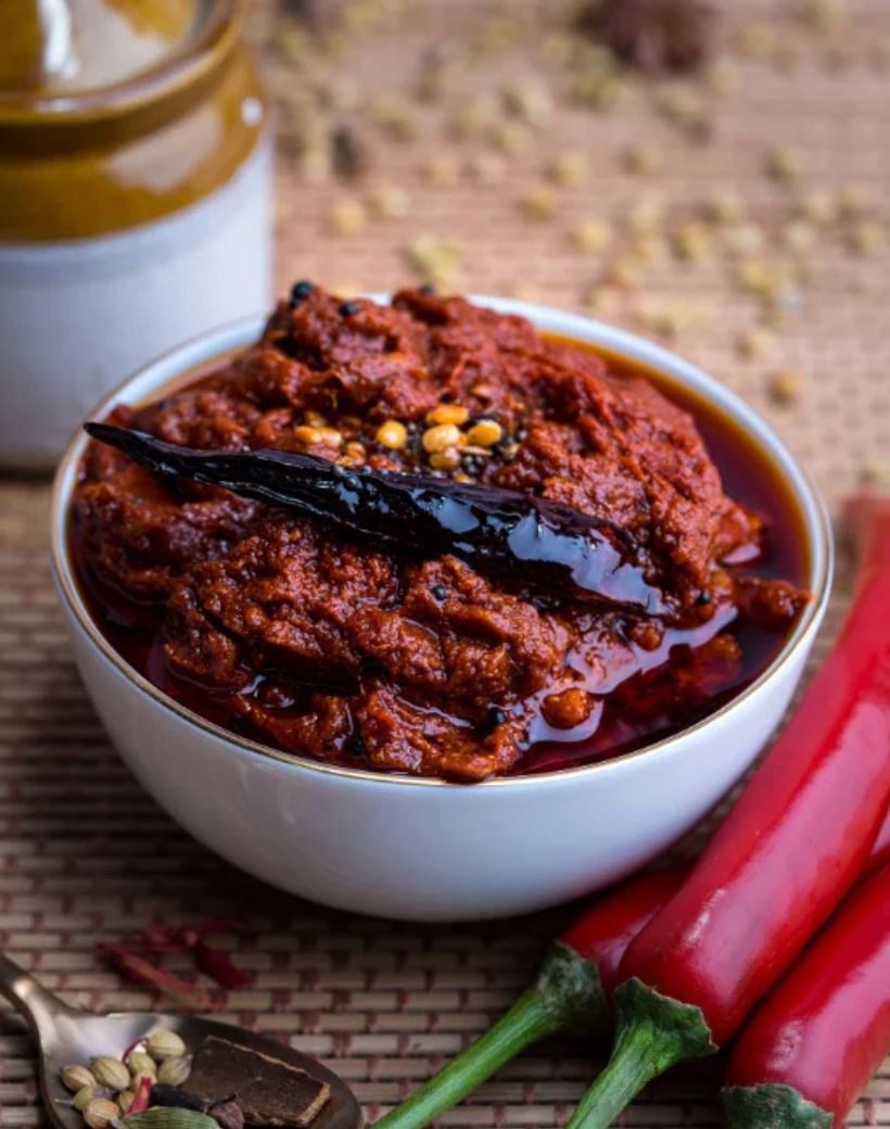 Pandumirchi Pickle is a fiery Andhra pickle made from sun-dried red chillies and aromatic spice blends.